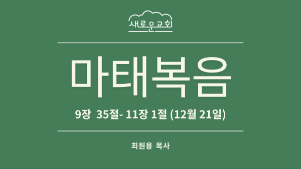 12월 21일 주일설교 페이지 정보 목록 본문 ◀◀ ▶▶ https://youtu.be/s-osBZF8KaQ 첨부파일 마태복음 피피티.pptx (105.7K) 0회 다운로드 | DATE : 2025-12-21 13:56:47 이전글성탄예배설교 (2025) 25.12.25 다음글12월 14일 주일설교 25.12.14