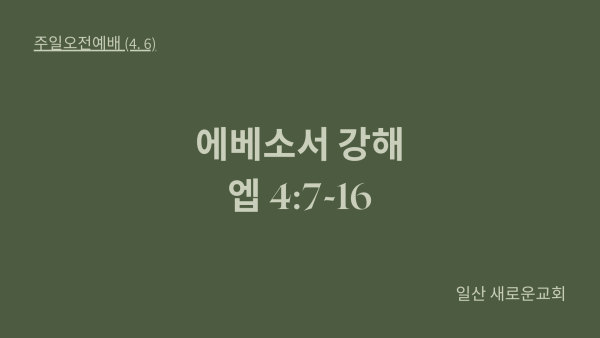 4월 6일 주일예배 페이지 정보 목록 본문 ◀◀ ▶▶ https://youtu.be/8dGc7BcPuJY 첨부파일 에베소서 피피티.pptx (76.4K) 0회 다운로드 | DATE : 2025-04-06 14:49:08 이전글주일오전설교(4.13) 25.04.13 다음글3월 30일 주일예배 25.03.30